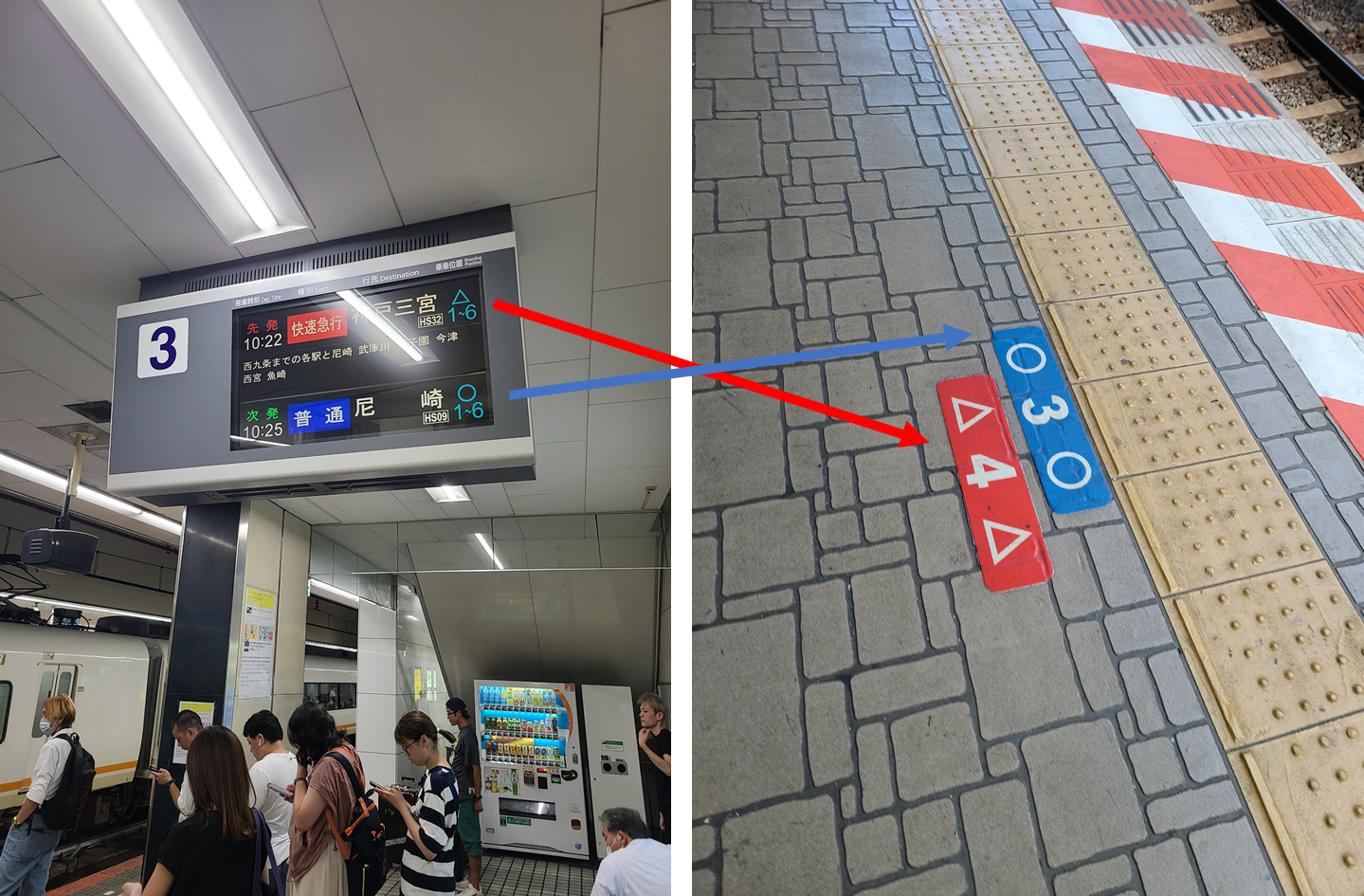아, 그리고 전광판에서 열차를 확인할수도 있고, 세모 / 동그라미는 열차 문 열리는 위치이니 참고해 주세요~